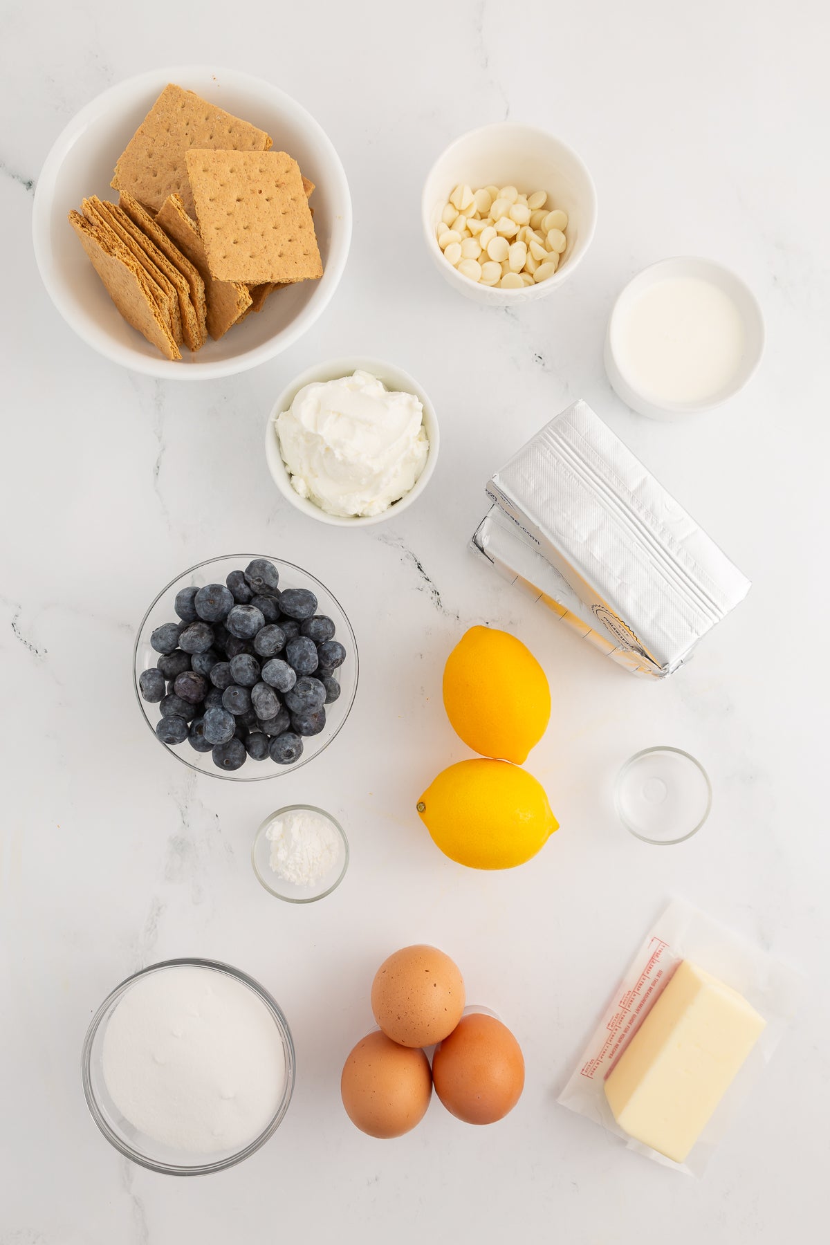 Graham crackers, cream cheese, blueberries, lemons, heavy cream, white chocolate chips